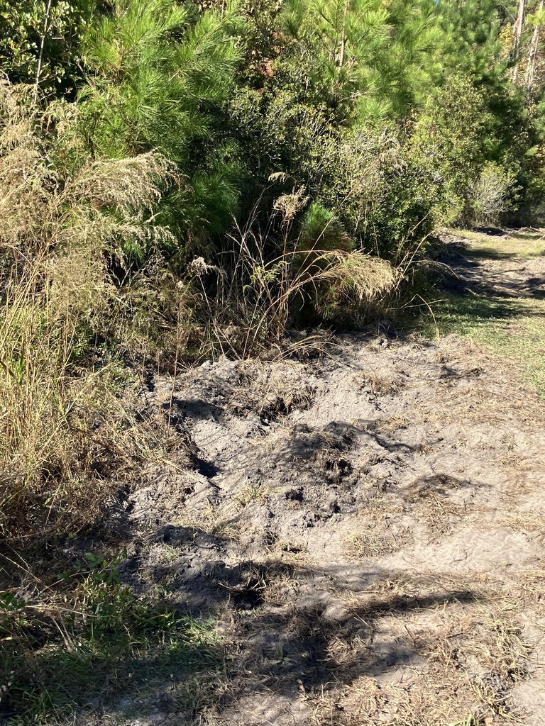 Short cylindrical snouts, tusks, thick coarse fur, disturbed soils, and wallows.